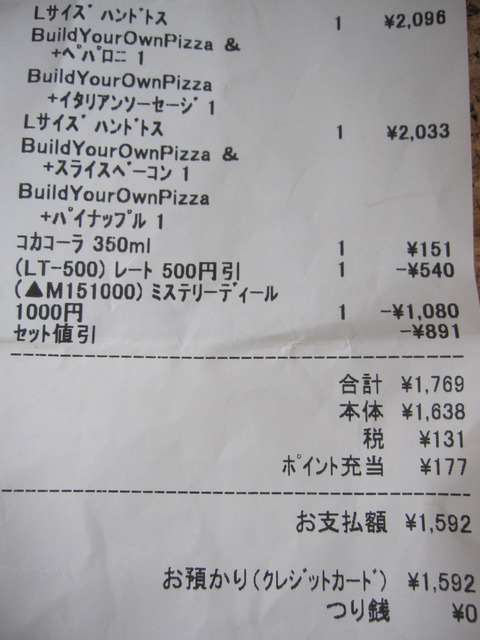 会員登録後は、「1,000円OFFクーポン」や「雨の日500円引きクーポン」などおトクな情報が定期的に送られてきます。いろいろな割引を上手く併用してかなり安く注文できるので、ゲーム感覚でおトクな組み合わせに挑戦したくなります。ますますドミノさんの思うつぼですね。W家は先日、調子に乗って英語サイトからLarge & Large(Lサイズ×2枚)注文して食べきれず、翌日の朝食もピザでした。だって安かったんだもん(クーポン・楽天ポイント利用で税込み1,600円以下でした)。残ったピザはフライパンで温め直すと最後まで美味しく頂けますよ(^^♪
